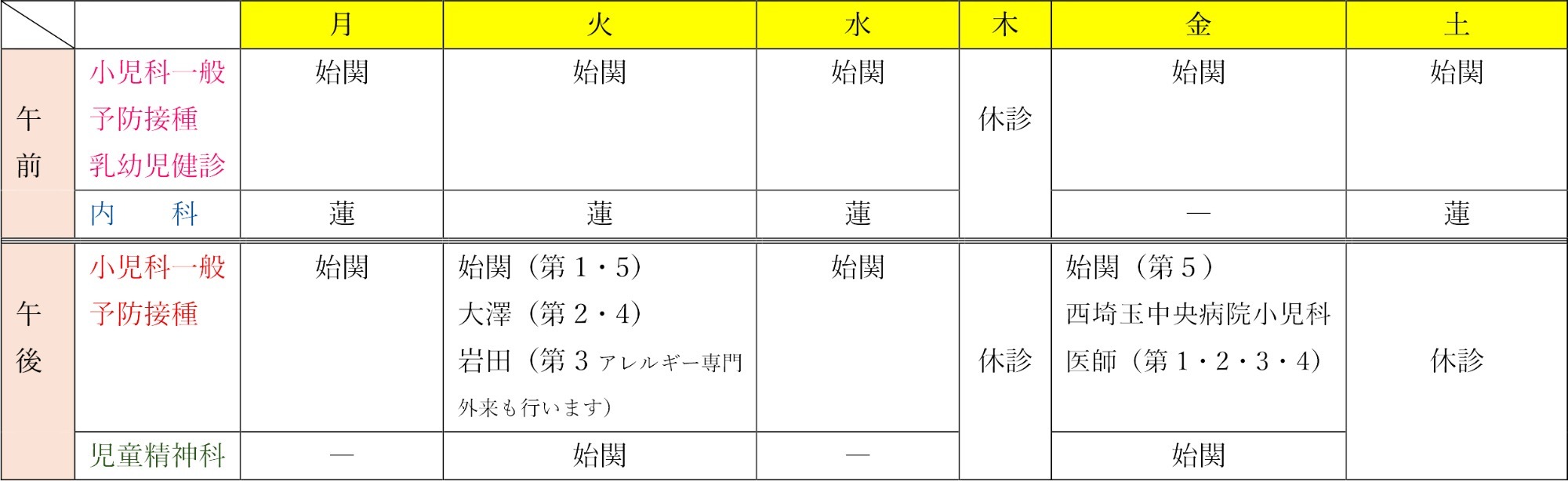 毎週金曜日(第5は始関先生が担当)午後は、西埼玉中央病院の小児科の先生が、交替で診療にあたってくださいます。